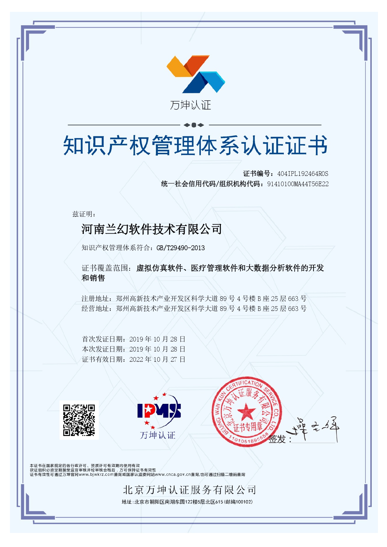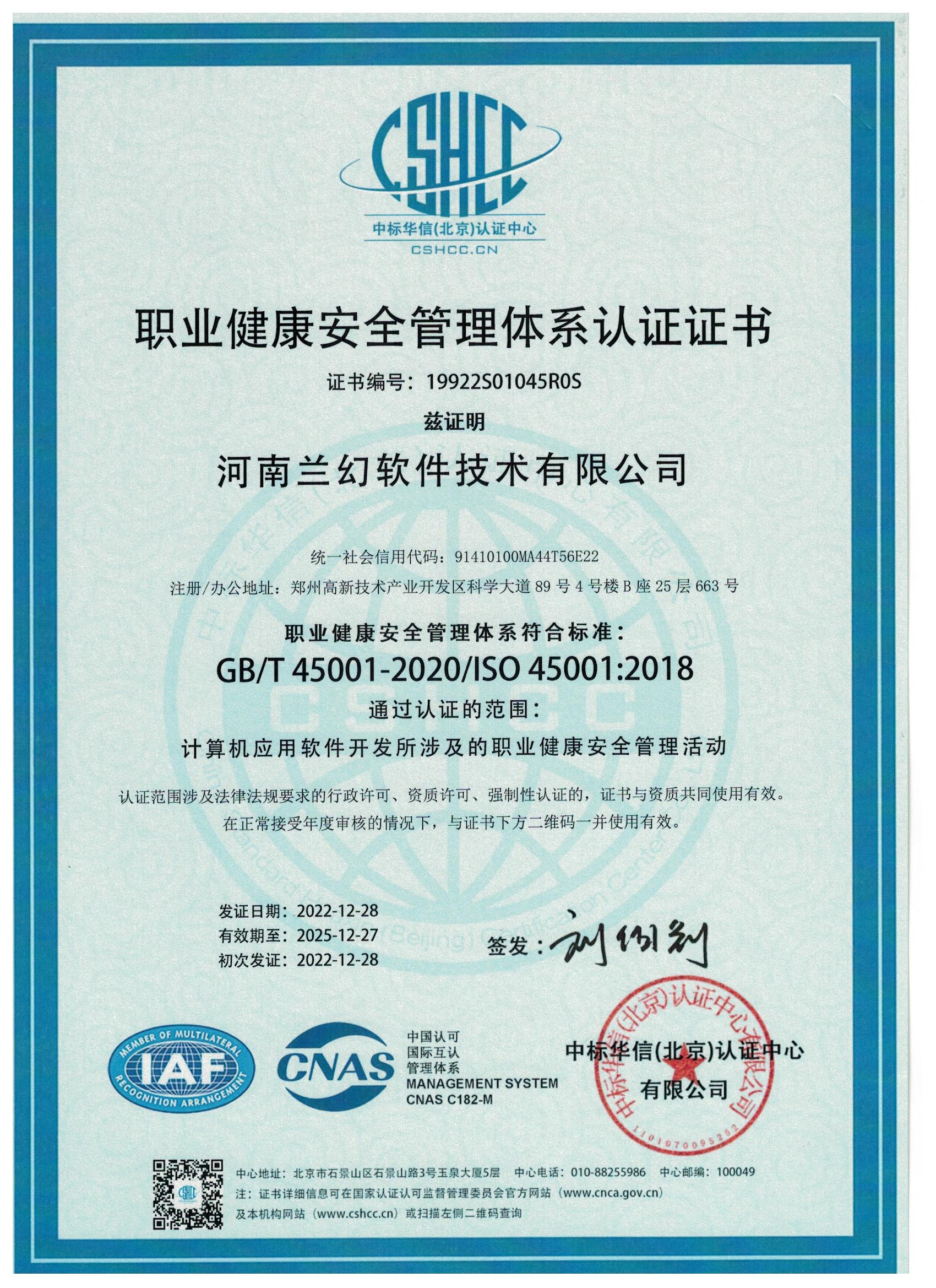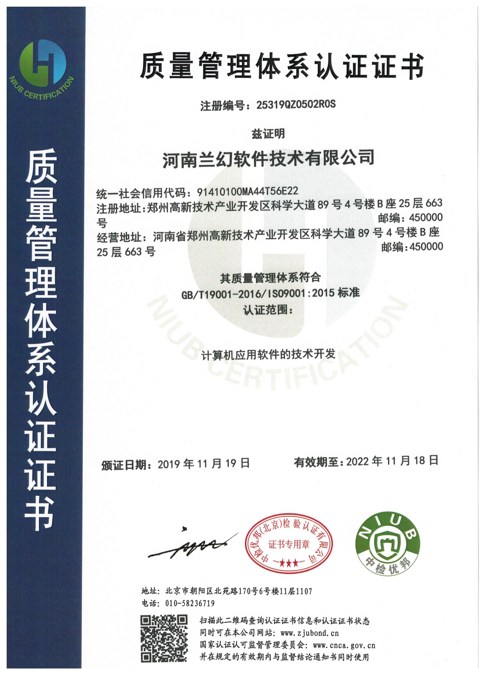 2019年獲得河南軟件協會"雙軟"認證、ISO9001質量管理體系認證、 知識產權管理體系認證。
