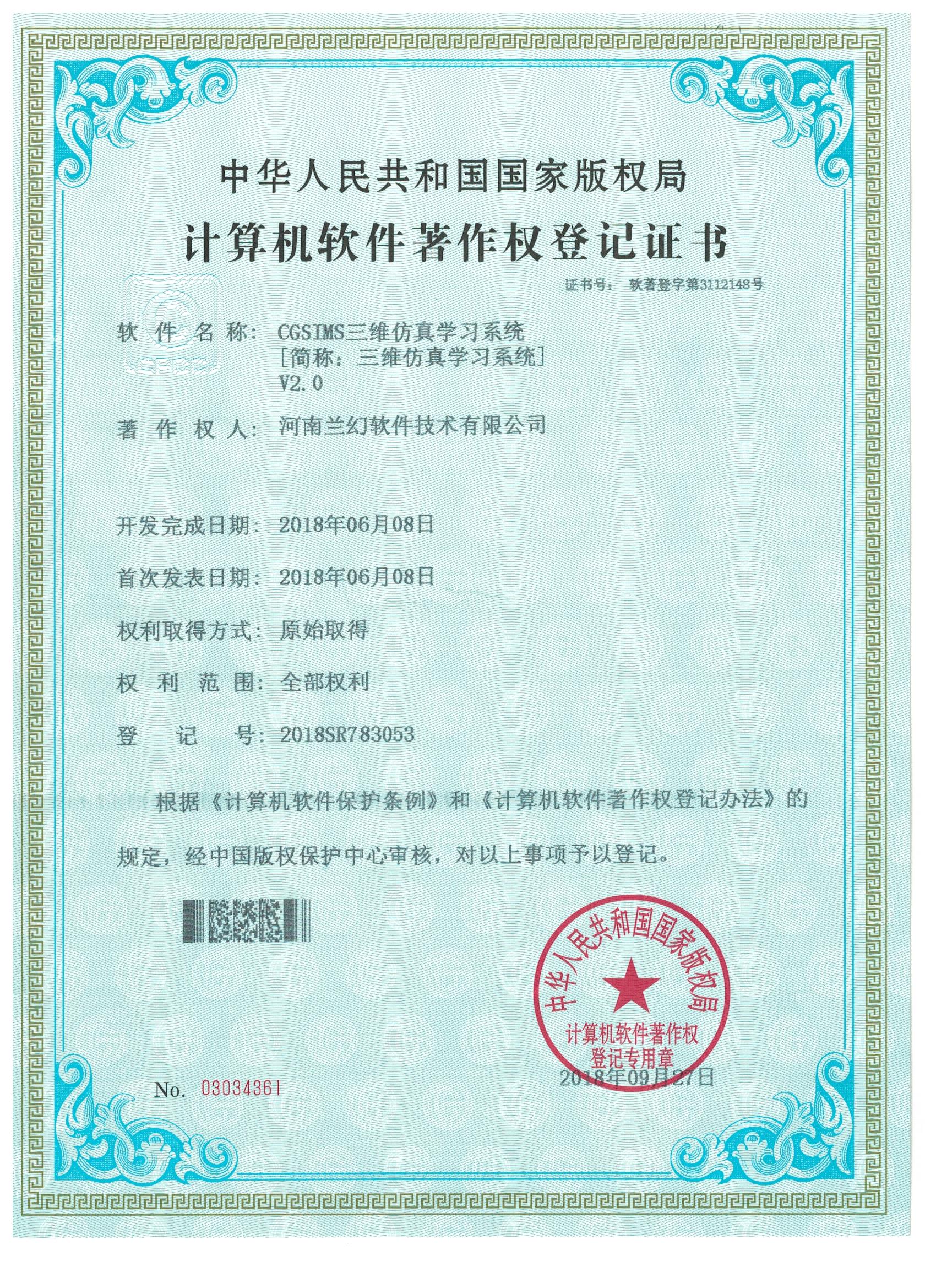 2018年公司軀體化評估系統、CGSIMS三維仿真學習系統、高血壓隨訪平臺等獲得多個軟件著作權證。