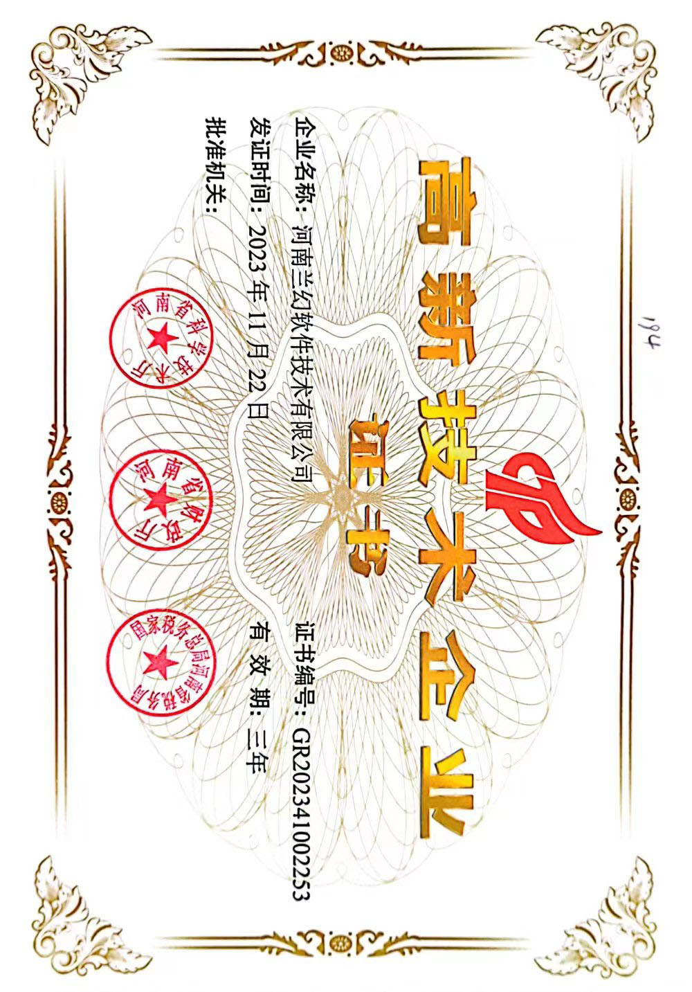2023年再次被河南省科學技術廳、河南省財政廳、國家稅務總局河南省稅務局三方認證“高新技術企業”
